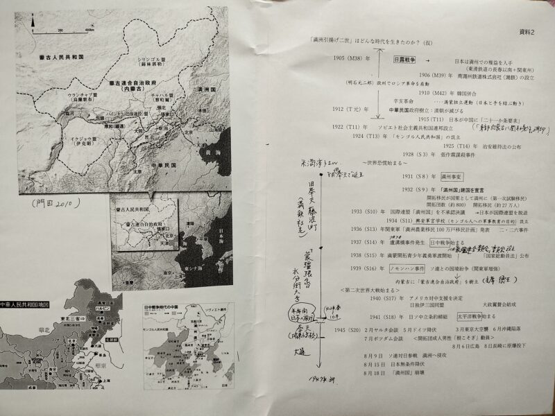 また、小学校の学芸発表会の時に、来賓として「愛新覚羅溥儀」や蒙古連合自治政府の主席「徳王」も来ていたと。すごく正装してきていて、同級生と「モンゴルの王様なんだって。」と話していた、ということでした。