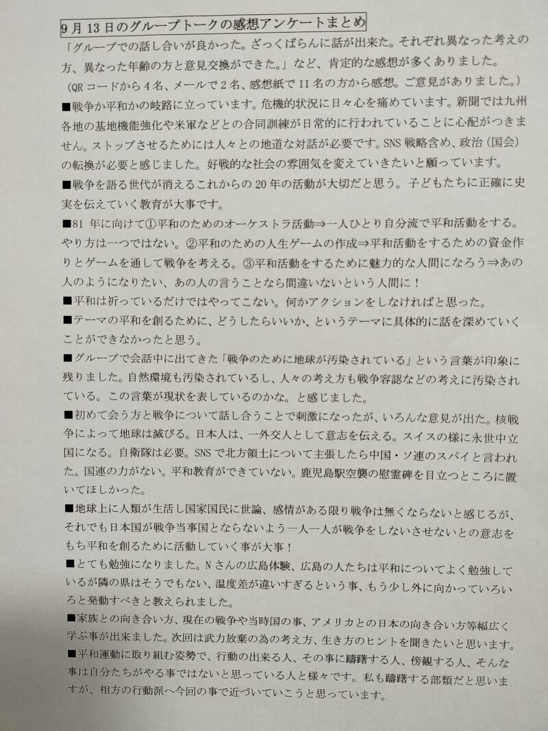 テーマが「戦争をしない、させない、平和を創るために」という誰もが賛成できそうなテーマで、抽象的ではあるけれど切り口は多様なので参加者それぞれが自由に自分の意見を述べることが出来たのではと思います。