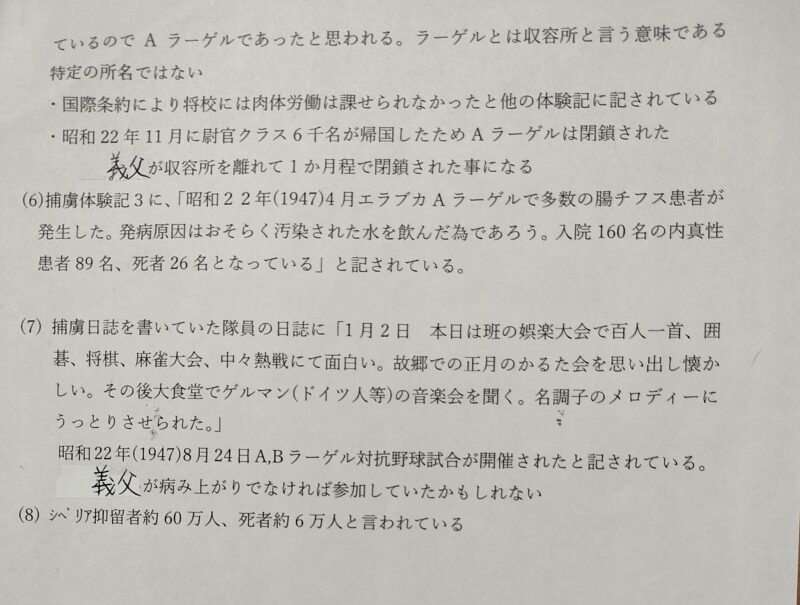 Yさんの奥様のお父様がシベリア抑留体験者であり、体験記を家族に残されているお話をしてくださいました。