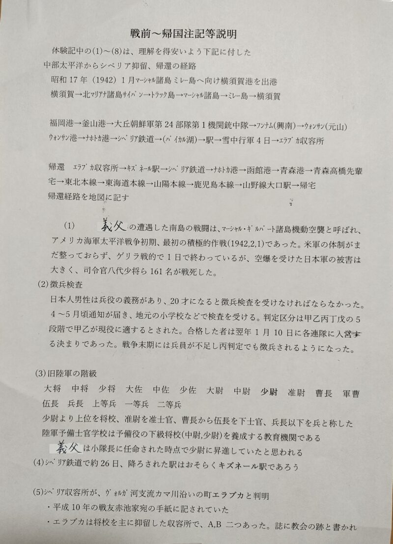 Yさんは、義父の体験記が子供や孫達の理解の助けになれば、と注記説明文を作成しておられます。文末の()番号は、注記番号で、最後に載せてあります。