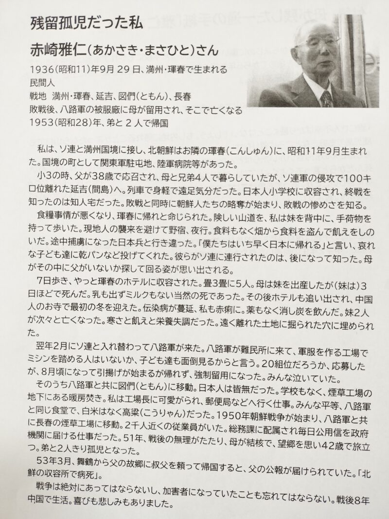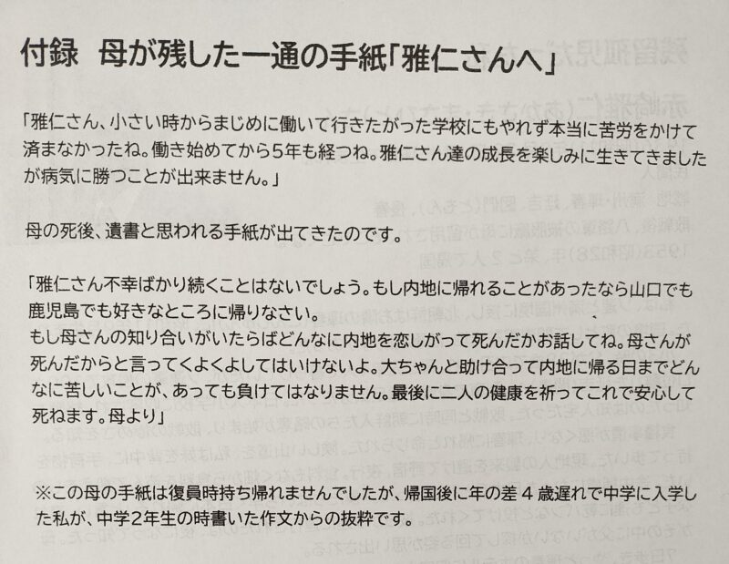 ←の手紙は、引揚げ2年前の1951年に中国で亡くなられたお母さんが書かれた手紙の内容を、覚えておらえて書かれたものです。