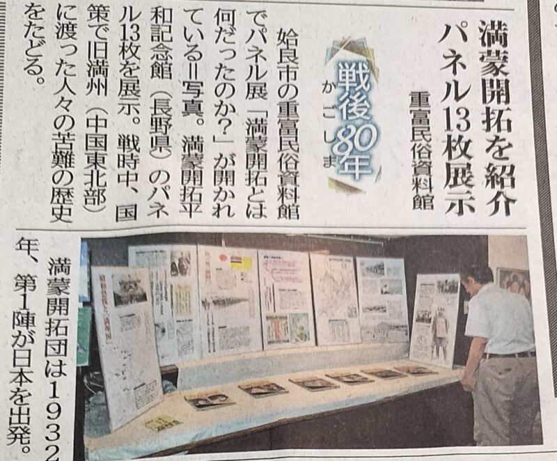 展示パネルは、満蒙開拓が国策として推進され、人々が満州へ渡って行った背景が、当時の新聞記事や写真を添えて説明されていました。全国から約800の開拓団が満州に渡りましたが、その多くは現地の中国人の農地や家を半強制的に買い上げ、追い出したものでした。